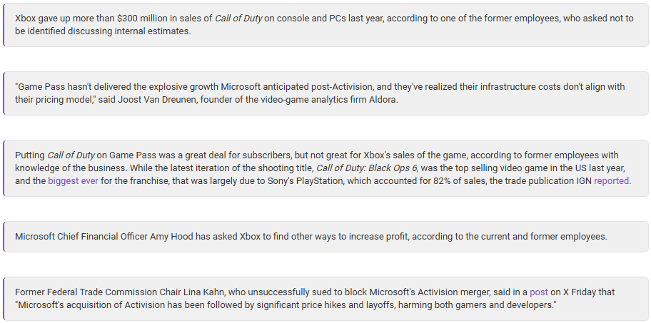 „Xbox verzichtete laut einem ehemaligen Mitarbeiter, der anonym bleiben wollte und sich auf interne Schätzungen bezieht, im letzten Jahr auf mehr als 300 Millionen Dollar Umsatz mit Call of Duty auf Konsolen und PCs. Game Pass hat nach der Activision-Übernahme nicht das explosive Wachstum gebracht, das Microsoft erwartet hatte, und man hat erkannt, dass die Infrastrukturkosten nicht zum Preismodell passen“, sagte Joost Van Dreunen, Gründer der Videospiel-Analysefirma Aldora.