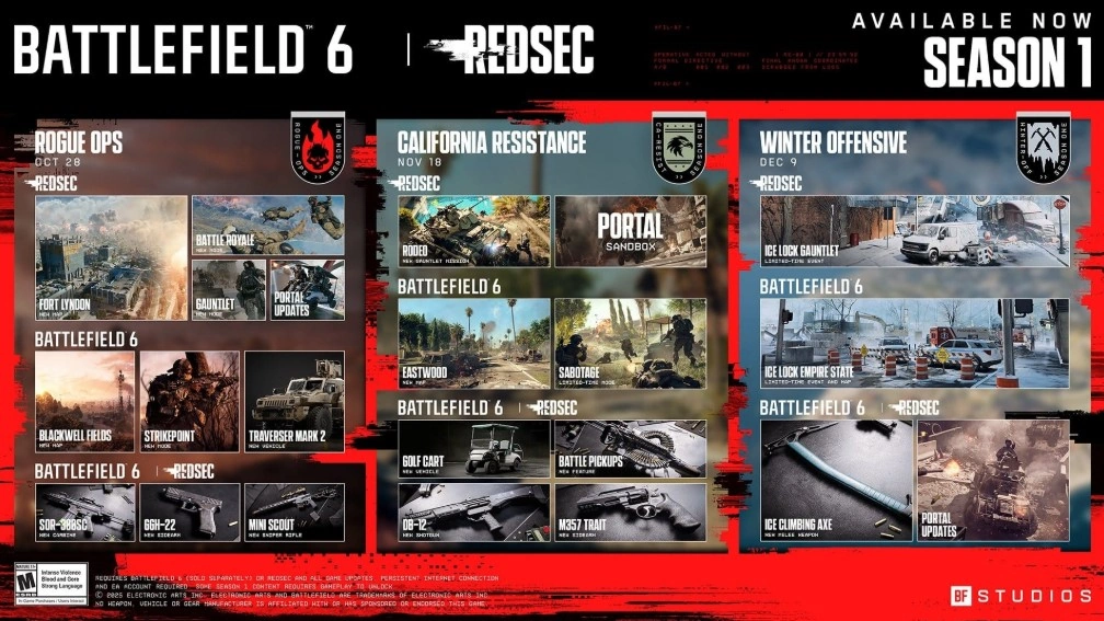 Parallel zum REDSEC-Start begann auch die erste Season von Battlefield 6. Sie bringt ein überarbeitetes Battle-Pass-System mit vier Themenpfaden und über 100 freischaltbaren Inhalten für beide Spiele. Neue Missionen, Events und kosmetische Belohnungen sollen die kommenden Wochen füllen.