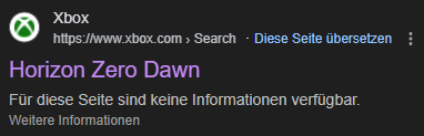 Wer aktuell in seinem Browser nach „Horizon Zero Dawn Xbox" sucht, stößt auf einen Link, der direkt zum Spiel für Xbox führen soll. Klickt man darauf, landet man allerdings nur auf der deutschen Xbox-Seite - mit dem Hinweis, dass die angeforderte Seite nicht verfügbar ist.