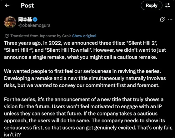 Der Produzent der Reihe, Motoi Okamoto, erklärte in einem Beitrag auf X (ehemals Twitter), dass die gleichzeitige Ankündigung zeigen sollte, dass Konami hinter dem Franchise steht.