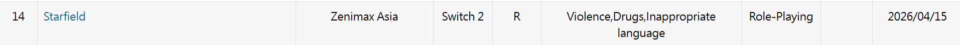 Starfield rated for Nintendo Switch 2 in Taiwan https://t.co/9h1TySHZxD pic.twitter.com/rqpqCO4J7i