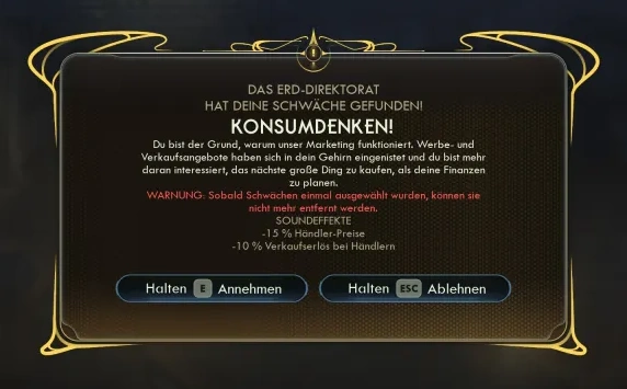 Diese Kritik wird spielerisch umgesetzt: Wer sich zu sehr von Marketing und Verkäufen leiten lässt, profitiert zwar von einem 15 % Rabatt bei Händlern, muss jedoch beim Verkauf von Gegenständen 10 % Wertverlust in Kauf nehmen. Eine clevere Mechanik, die Spieler*innen auf humorvolle Weise zeigt, dass übermäßiger Konsum auch Nachteile haben kann.