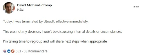 Ubisoft hat mich heute über eine dreitägige unbezahlte disziplinarische Suspendierung informiert, die ab morgen in Kraft tritt. Die Maßnahme wurde mir als im Zusammenhang mit öffentlichen Kommentaren dargestellt, die ich zur Rückkehrpflicht ins Büro geäußert habe, sowie mit einem angeblichen Verstoß gegen die Treuepflicht. Ich teile diese Information aus Gründen der Transparenz. Ich nehme die Entscheidung zur Kenntnis und werde mich zum jetzigen Zeitpunkt nicht weiter dazu äußern."