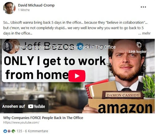 Auf LinkedIn hatte sich Michaud-Cromp zuvor offen zur Entscheidung des Unternehmens geäußert, Beschäftigte künftig wieder an fünf Tagen pro Woche ins Büro zu verpflichten.